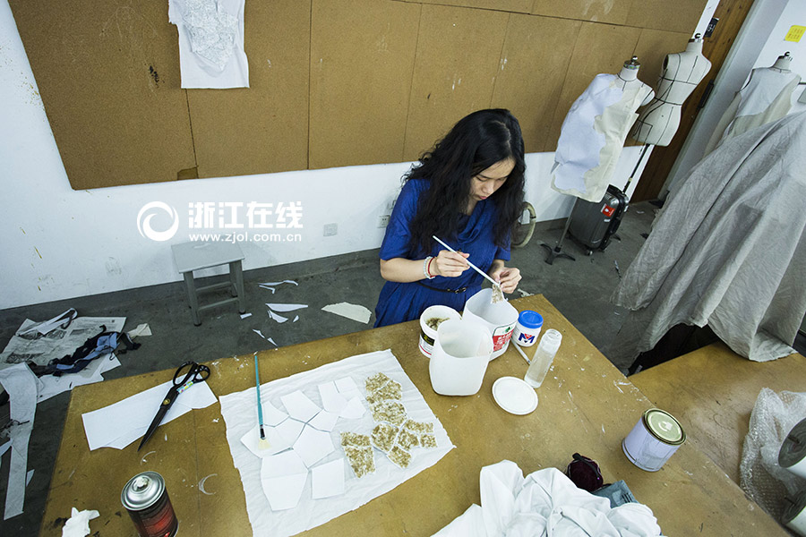Mei works on the sand and stone materials. (Photo source: zjol.com.cn)