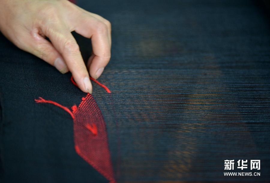 A worker weaves Xilankapu, a Tujia brocade, at a brocade company in Enshi Tu and Miao Autonomous Prefecture, central China's Hubei Province, June 2, 2015. (Photo/ Xinhua)