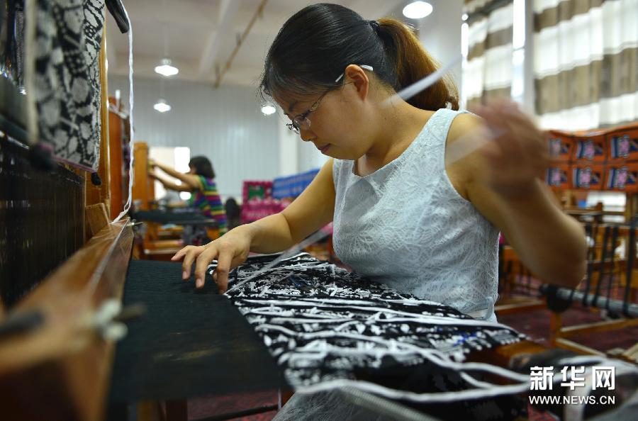 A worker weaves Xilankapu, a Tujia brocade, at a brocade company in Enshi Tu and Miao Autonomous Prefecture, central China's Hubei Province, June 2, 2015. (Photo/ Xinhua)