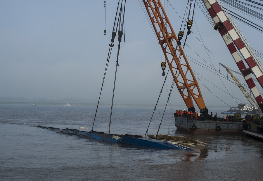Rescue team turns capsized cruise ship 90 degrees onto its side. (Photo/ Xinhua)