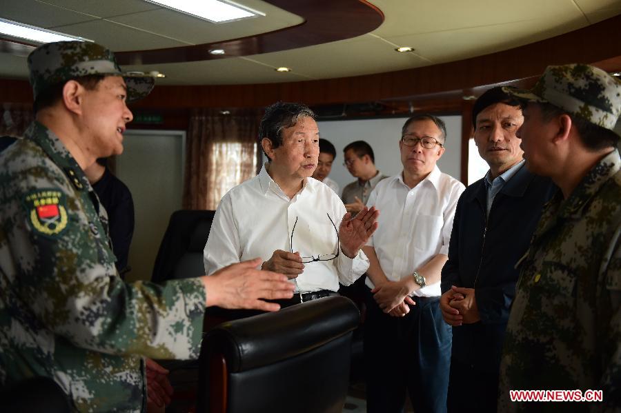 Chinese Vice Premier Ma Kai (C) inspects the rescue scene of the capsized cruise ship Eastern Star in the Jianli section of the Yangtze River in central China's Hubei Province, June 5, 2015. Ma chaired a meeting on search and rescue work of the capsized vessel in Jianli on Friday. (Xinhua/Hao Tongqian) |