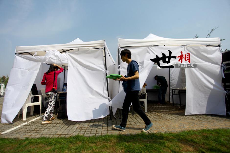 Members of Quark make preparations in the tent before the music festival. (Www.cnwest.com/He Tong)