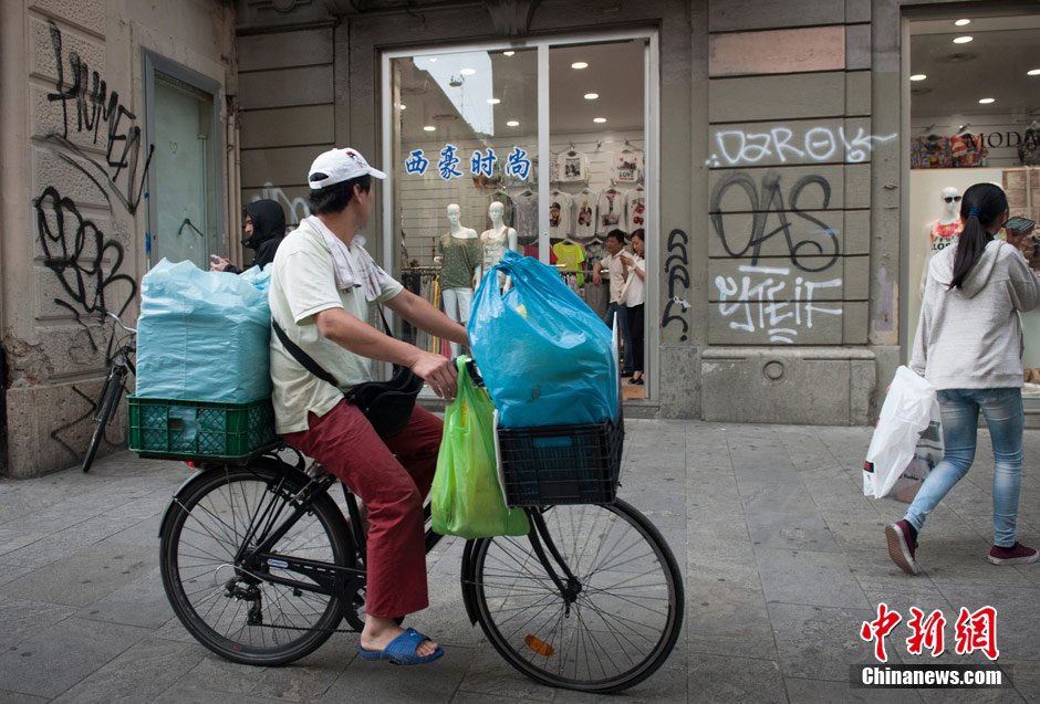 A Chinese man on a bicycle sells steamed dumplings and cold noodles in Via Paolo Sarpi, Milan, Italy, June 4, 2015. (CNS/Li Qing)