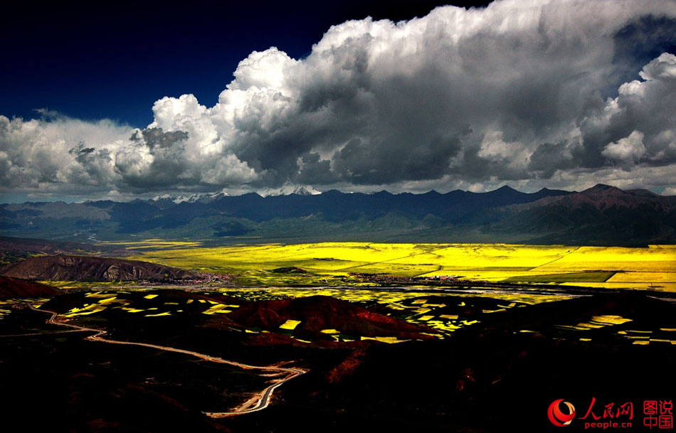 Picturesque scenery of rape flowers in Menyuan Hui Autonomous County, northwest China's Qinghai Province. More than 500,000 mu (about 33,000 hectares) of rape flowers attract many tourists here. (Photp/people.cn)
