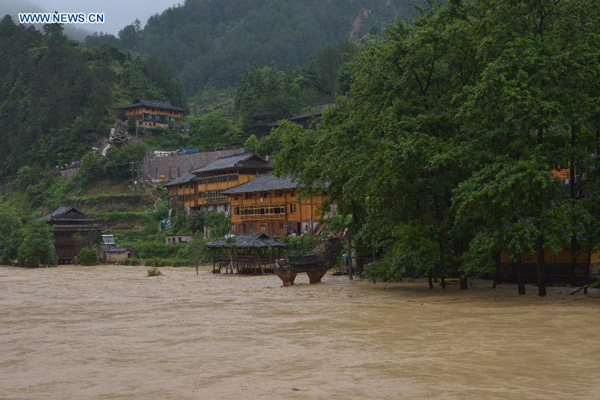 A vacation resort is submerged by water in Nanhua Village, southwest China's Guizhou Province, June 8, 2015. Heavy rains continued to batter southern regions of China on Monday. (Xinhua/Yuan Renlin) |