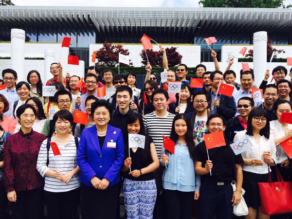 China's vice premier Liu Yandong (3rd from the left, front row) poses for photo with Chinese supporters holding Chinese and Olympic flags in Lausanne.[Photo/chinadaily.com.cn]