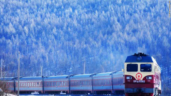 The photo shows a K1301 train running in snowy forest.(Photo/Wang Wei)