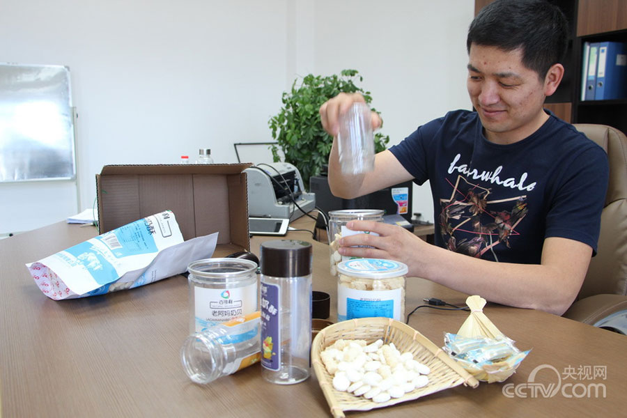 Bai Rui buys some products similar to those of his company to study their taste and packaging. (CNTV/Du Xiaojing)