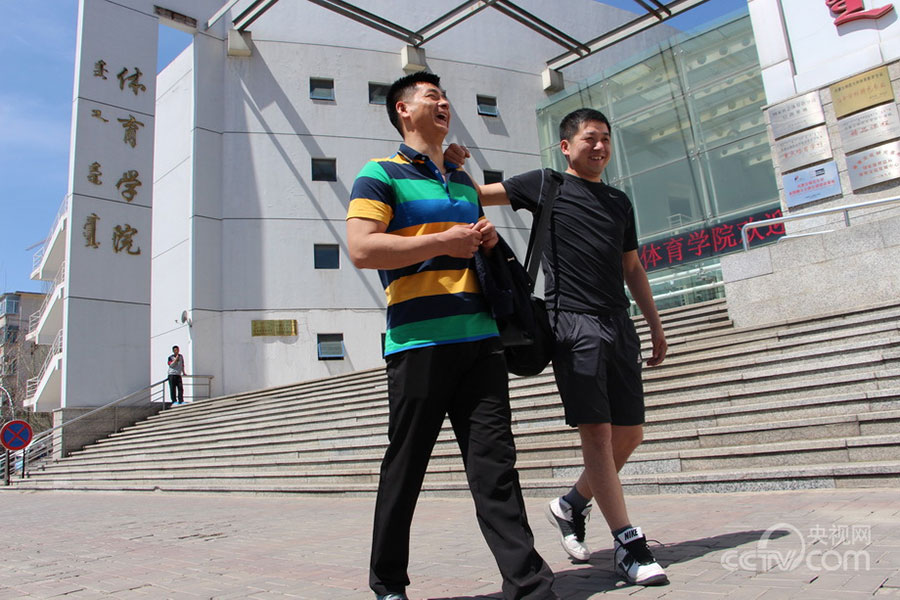 Bai Rui goes back to his university and talks about the old time with his classmates in the free time. (CNTV/Du Xiaojing)