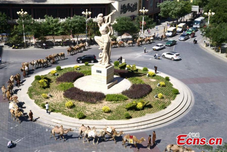 A tea trade caravan from Jingyang county, Shaanxi province arrives in Dunhuang city, Northwest China’s Gansu province, June 10, 2015. Organized by Shaanxi government and a local tea company, the Silk Road Cultural Journey from Jingyang is expected to finish in Kazakhstan more than a year later. Camels, horse-drown carriages and people in ancient Chinese costumes will travel an estimated 15,000 kilometers along the ancient Silk Road route with tea leaves while giving performances and promoting the tea products on the way.
