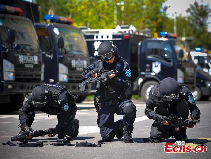 Special Police try a multifunctional support for the QSZ-92 pistol in Urumqi city, capital of Northwest China’s Xinjiang Uygur autonomous region, June 9, 2015. The newly developed gun support, made of high-strength composite, can improve the precision and stability of the semi-automatic QSZ-92 pistol.