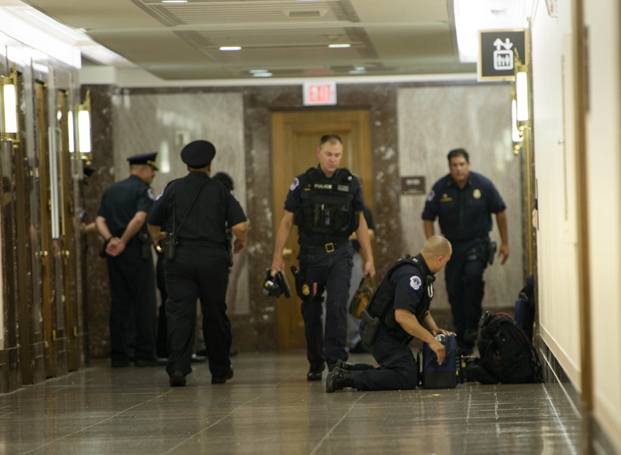 Police officers gather at the Capitol Hill after suspicious goods were found here on June 9, 2015. (Xinhua/AFP)