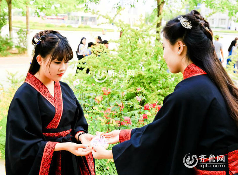 Several students of Shandong Business Institute cerebrate the upcoming Dragon Boat Festival with a Hanfu show. (Photo/ Iqilu.com)