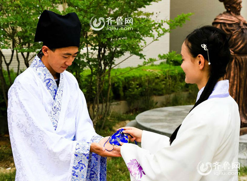 Several students of Shandong Business Institute cerebrate the upcoming Dragon Boat Festival with a Hanfu show. (Photo/ Iqilu.com)