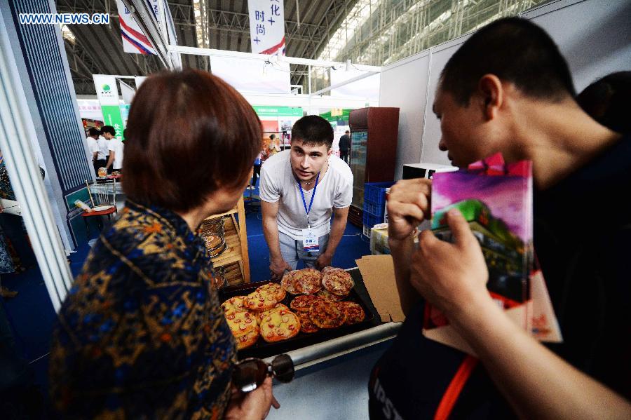 A Russian worker introduces Russian pizza to visitors during the 2015 China-Russia Cultural Exhibition in Harbin, capital of northeast China's Heilongjiang Province, June 11, 2015. (Xinhua/Wang Kai)