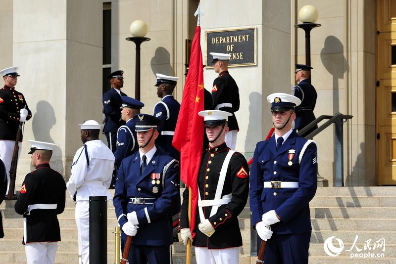 The two shook hands and then walked up the stairs and stood facing the enhanced honor cordon and saluted when the national anthems of China and the United States were played by the military band. The two then walked into the Pentagon building for a meeting closed to the press. It was expected that the two will discuss a wide range of issues regarding the two militaries, including the situations in the South China Sea.