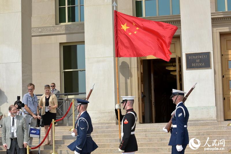 The two shook hands and then walked up the stairs and stood facing the enhanced honor cordon and saluted when the national anthems of China and the United States were played by the military band. The two then walked into the Pentagon building for a meeting closed to the press. It was expected that the two will discuss a wide range of issues regarding the two militaries, including the situations in the South China Sea.