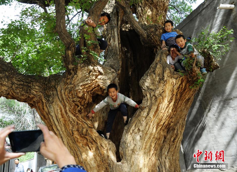 Villagers set up a tea table inside an 800-year-old tree in Ahetan village of Hualong county, northwest China’s Qinghai province on June 10, 2015. (Chinanews/Jiang Yaqin)