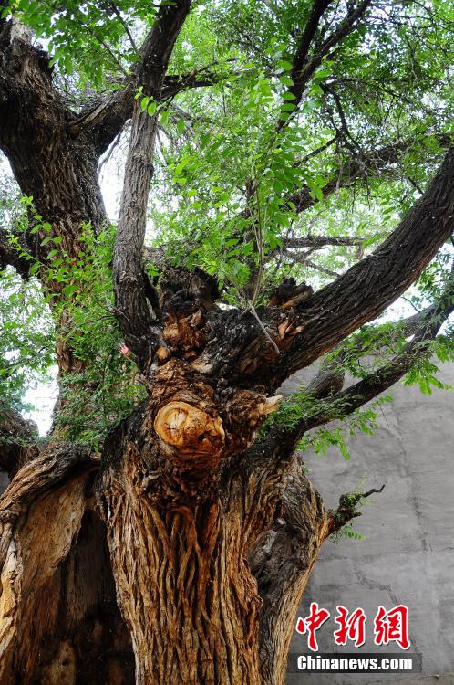 Villagers set up a tea table inside an 800-year-old tree in Ahetan village of Hualong county, northwest China’s Qinghai province on June 10, 2015. (Chinanews/Jiang Yaqin)