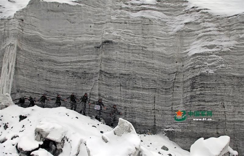 The photo shows a frontier company called Khunjerab company patrolling in the snow. Khunjerab means a bloodstained passage in Tajik language. Khungerab Pass is located at the westernmost point of the Pamirs with an average elevation of more than 4,800 meters. In each patrol, soldiers might be confronted with mud-rock flows, snow storms, hails, avalanches and animal attacks. (Photo/81.cn) |