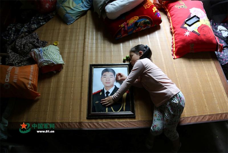 Xu Yuan, 29, is a non-commissioned officer. He was diagnosed with advanced gastric cancer just three months before his discharge from the army. At that time, he expressed a wish to donate his corneas. The photo shows his four-year-old daughter lying on bed with her hands on a photo of her father, calling her father. This little girl does not know what death is.(Photo/81.cn) |