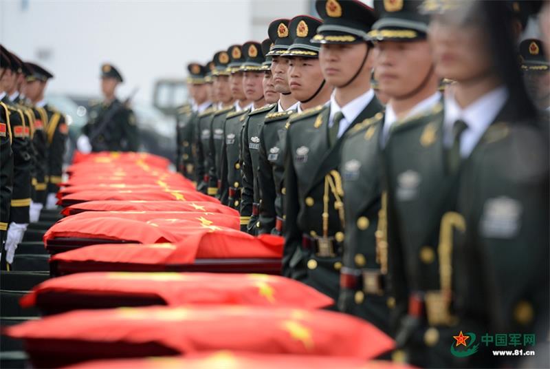 After resting in a foreign country for more than 60 years, the exhumed remains of the former Chinese People's Volunteers (CPV) who died during the Korean War (1950-53) in the Republic of Korea finally arrived at Shenyang Taoxian International Airport on March 28, 2014. Soldiers of the Chinese People's Liberation Army escort coffins containing the remains of 437 soldiers of the CPVs who were killed in the Korean War. (Photo/81.cn) |