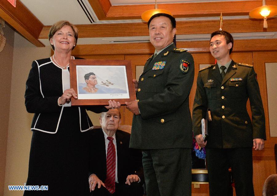 Vice Chairman of China's Central Military Commission Fan Changlong (C) meets with Nell Calloway (L), grand-daughter of General Chennault, in Washington D.C., the United States, June 12, 2015. China always remembers the contribution and sacrifice made to it by the United States and the American people during the World War II, said Fan Changlong here Friday. (Xinhua/Bao Dandan) |