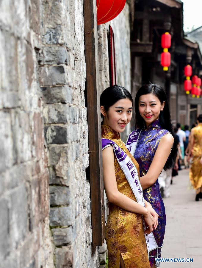 Contestants of the 2015 Miss Tourism Queen International of China division pose for pictures in Anju ancient town of southwest China's Chongqing Municipality, June 12, 2015. More than 50 contestants will compete in a series of individual events which would begin on Friday and China final on June 21 in Anju ancient town. (Xinhua/Liu Chan)