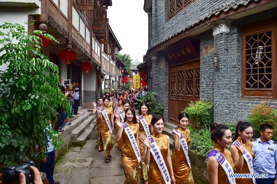Contestants of the 2015 Miss Tourism Queen International of China division pose for pictures in Anju ancient town of southwest China's Chongqing Municipality, June 12, 2015. More than 50 contestants will compete in a series of individual events which would begin on Friday and China final on June 21 in Anju ancient town. (Xinhua/Liu Chan)
