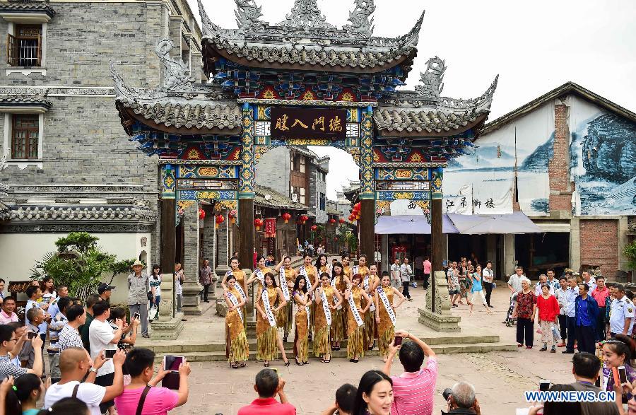Contestants of the 2015 Miss Tourism Queen International of China division pose for pictures in Anju ancient town of southwest China's Chongqing Municipality, June 12, 2015. More than 50 contestants will compete in a series of individual events which would begin on Friday and China final on June 21 in Anju ancient town. (Xinhua/Liu Chan)