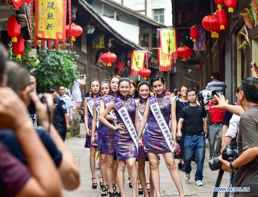 Contestants of the 2015 Miss Tourism Queen International of China division pose for pictures in Anju ancient town of southwest China's Chongqing Municipality, June 12, 2015. More than 50 contestants will compete in a series of individual events which would begin on Friday and China final on June 21 in Anju ancient town. (Xinhua/Liu Chan)