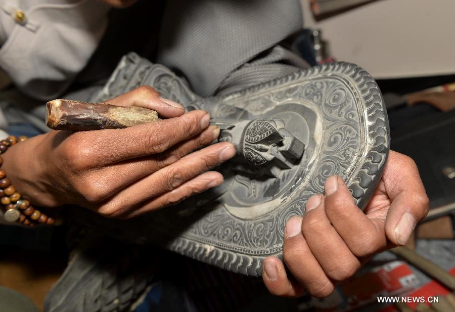 A craftsman shows the art of stone carving at an exhibition of Tibetan intangible cultural heritages in Lhasa, southwest China's Tibet Autonomous Region, June 12, 2015. The second exhibition on the protection of Tibetan intangible cultural heritages was held in Lhasa Friday. (Xinhua/Liu Dongjun) |
