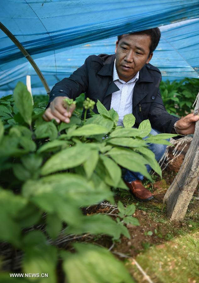 Zhu Guilin, a villager, takes care of ginsengs at Yulin Village in Ji'an, northeast China's Jilin Province, June 11, 2015. China has a long history of cultivating ginseng, which is considered to be nutritious and to have medicinal value in traditional Chinese medicine. Considered as the world's largest ginseng production area, Jilin produces about 85 percent of China's total ginseng output and 70 percent of the world's output. More than 98 percent of ginseng in Jilin is currently cultivated, not grown in the wild. (Xinhua/Wang Haofei) |