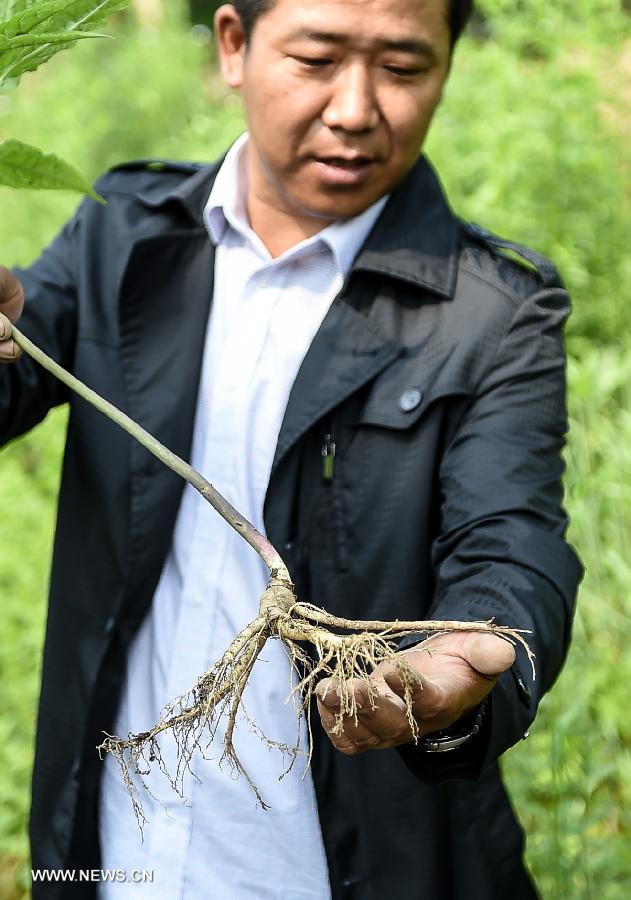 Zhu Guilin, a villager, looks over a ginseng at Yulin Village in Ji'an, northeast China's Jilin Province, June 11, 2015. China has a long history of cultivating ginseng, which is considered to be nutritious and to have medicinal value in traditional Chinese medicine. Considered as the world's largest ginseng production area, Jilin produces about 85 percent of China's total ginseng output and 70 percent of the world's output. More than 98 percent of ginseng in Jilin is currently cultivated, not grown in the wild. (Xinhua/Wang Haofei) |