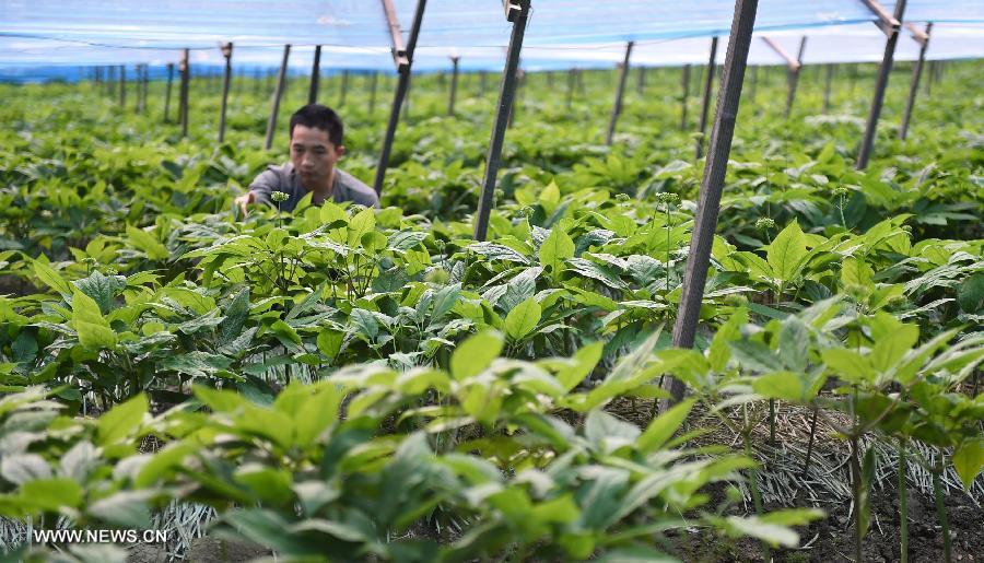 Lin Chengri, a villager, takes care of ginsengs at Shuangcha Village in Ji'an, northeast China's Jilin Province, June 11, 2015. China has a long history of cultivating ginseng, which is considered to be nutritious and to have medicinal value in traditional Chinese medicine. Considered as the world's largest ginseng production area, Jilin produces about 85 percent of China's total ginseng output and 70 percent of the world's output. More than 98 percent of ginseng in Jilin is currently cultivated, not grown in the wild. (Xinhua/Wang Haofei) |