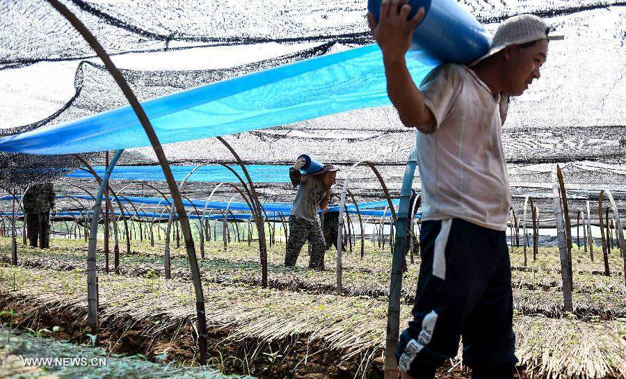 Villagers work in a ginseng plantation at Yulin Village in Ji'an, northeast China's Jilin Province, June 11, 2015. China has a long history of cultivating ginseng, which is considered to be nutritious and to have medicinal value in traditional Chinese medicine. Considered as the world's largest ginseng production area, Jilin produces about 85 percent of China's total ginseng output and 70 percent of the world's output. More than 98 percent of ginseng in Jilin is currently cultivated, not grown in the wild. (Xinhua/Wang Haofei)