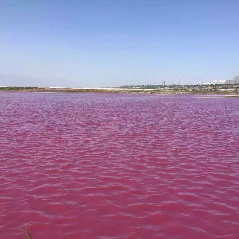The water turns pink in a salt lake in Yuncheng city, North China’s Shanxi province, June 11, 2015. People can float on the lake’s surface due to the water’s high salinity, which has earned the lake the name "China's Dead Sea.” People having been extracting salt crystals from the lake for over 4,000 years.(Source: Cina.org.cn)