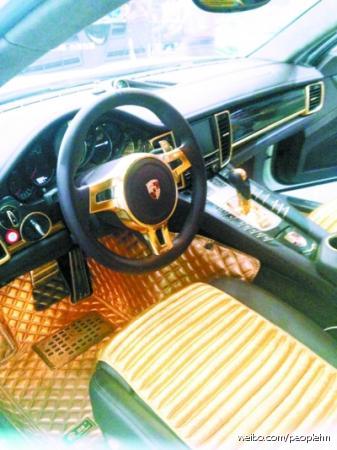 Various parts of the Porsche including its logo, vent, wheel button, gearbox lever, loud speaker lid and handle are gilded in gold. (Photo/Weibo) |
