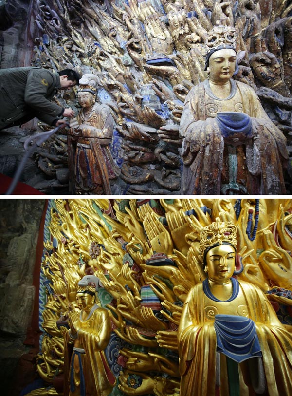 The Thousand-hand Bodhisattva before and after the restoration. (Photo/Xinhua)