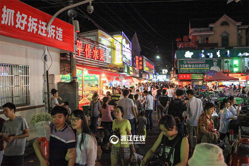 An area dubbed "Bargain Street" sees floods of people frequenting food stands, fast-food chains, Chinese restaurants, western restaurants and clothing stores in Hangzhou, east China's Zhejiang province.(Photo/zjol.com.cn)