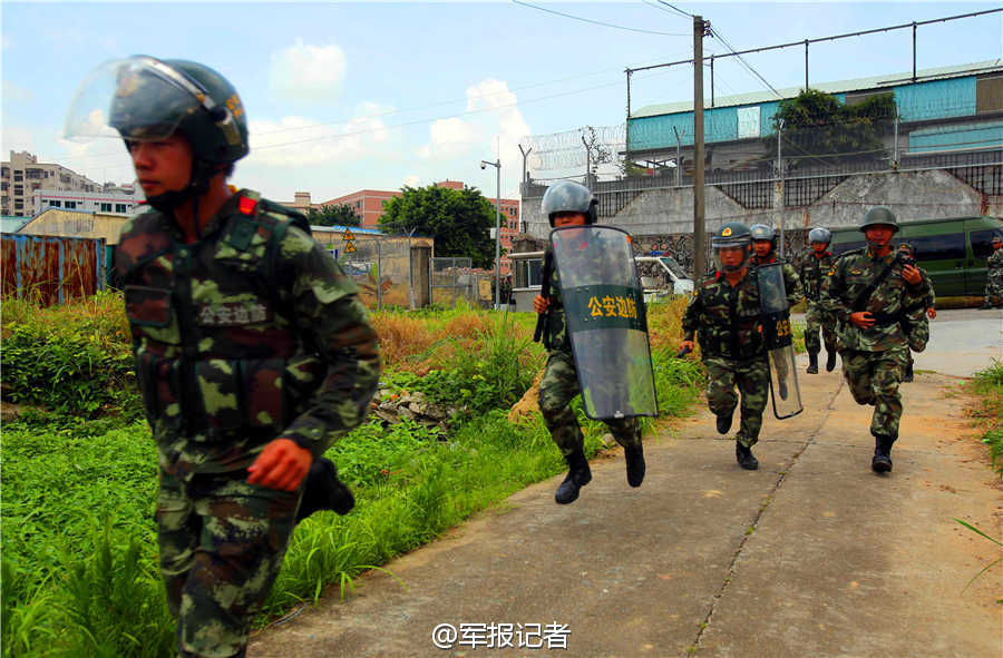 Over 200 officers from the border defense force of the the People's Armed Police force in Guangdong and Hong Kong border police jointly conduct an anti-smuggling and anti-stowaway exercise in the border area in Shenzhen, south China's Guangdong province on June 12, 2015, so as to enhance the cooperation level in joint operations. (Photo source: Weibo of PLA Daily)