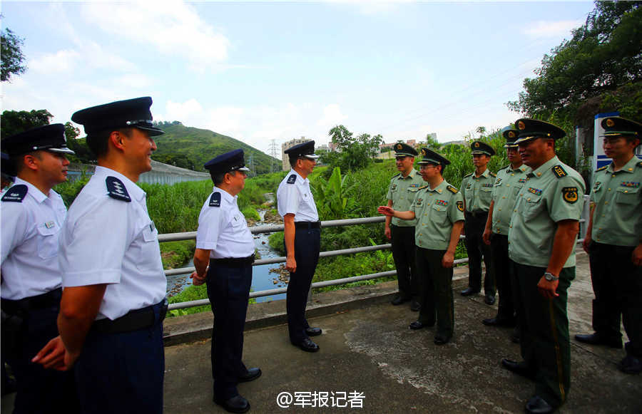 Over 200 officers from the border defense force of the the People's Armed Police force in Guangdong and Hong Kong border police jointly conduct an anti-smuggling and anti-stowaway exercise in the border area in Shenzhen, south China's Guangdong province on June 12, 2015, so as to enhance the cooperation level in joint operations. (Photo source: Weibo of PLA Daily) |