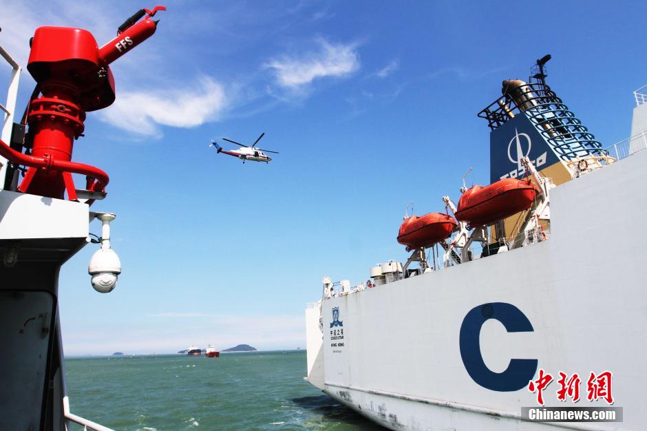 A passenger ship search and rescue exercise is conducted in Xiamen, southeast China’s Fujian province on June 15, 2015. Over 200 people, seven ships and two helicopters from maritime administration, fire control, emergency aid and other departments participated in the exercise. (CNS/Zeng Demeng)