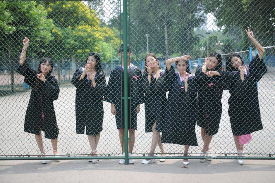 Eye-catching college graduates wearing pink ribbons take photos in Shandong University. (Photo/www. iqilu. Com)