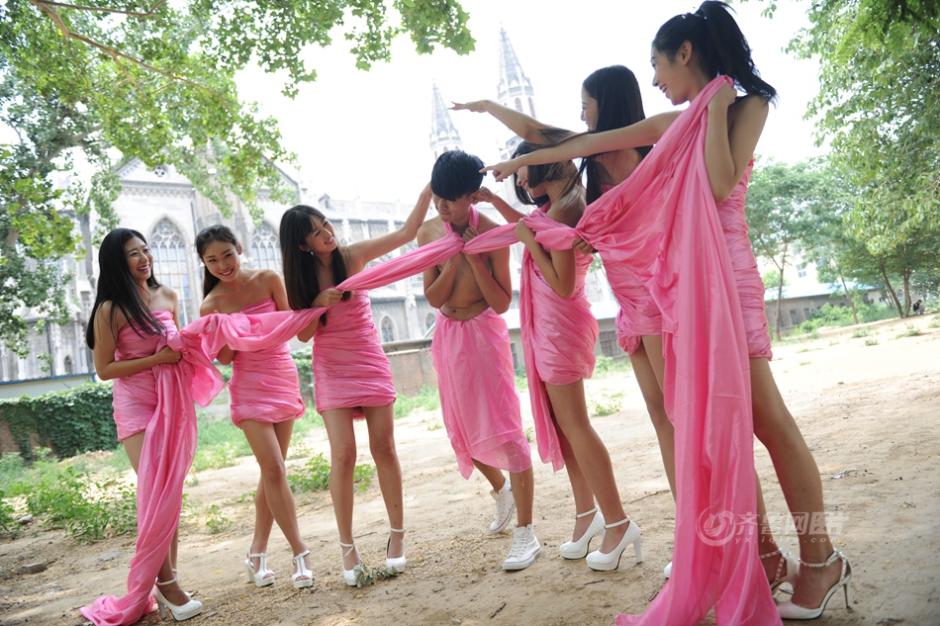 Eye-catching college graduates wearing pink ribbons take photos in Shandong University. (Photo/www. iqilu. Com)