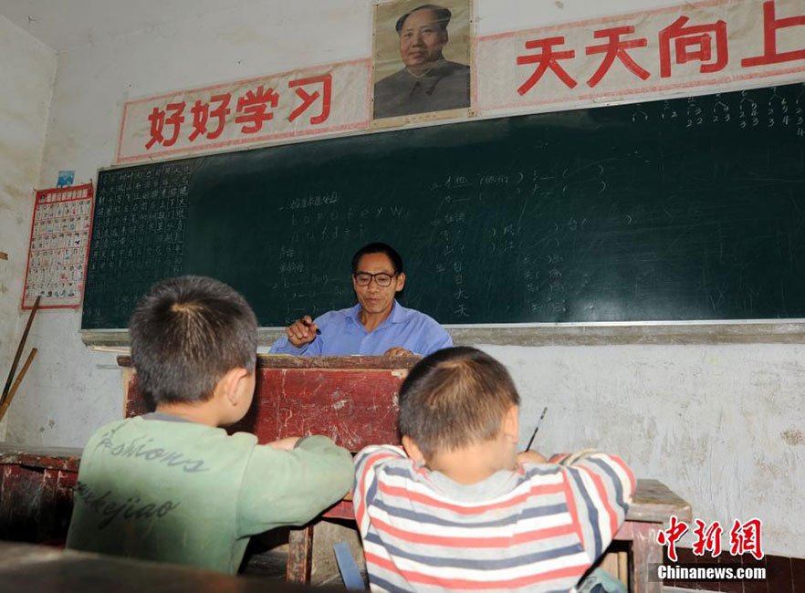 There are two teachers in the school. Mr Huang, over 60 years of age, was re-employed after retirement because no new teacher came here.