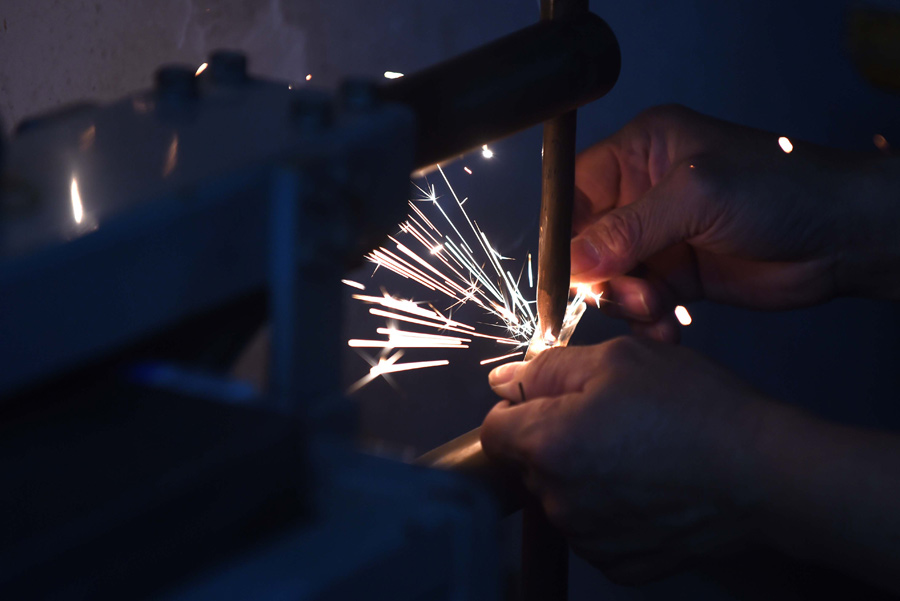 Zheng Shushan, a master of “Wushan Iron Calligraphy”, creates iron calligraphy works in his studio on June 16, 2015. (Xinhua/Xie Chen)