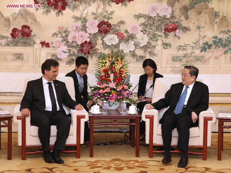 Yu Zhengsheng (R), chairman of the National Committee of the Chinese People's Political Consultative Conference (CPPCC), meets with Mitja Bervar, president of Slovenia's upper house National Council, in Beijing, capital of China, June 18, 2015. (Xinhua/Pang Xinglei) |