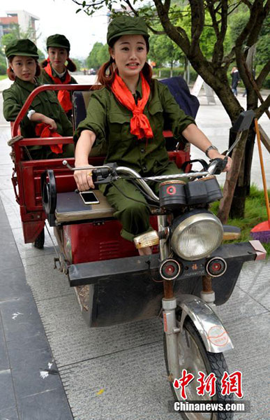 Several senior students wearing safety and industrial costumes take photos in Sichuan Arts and Science University. (CNS/Zhang Ji)