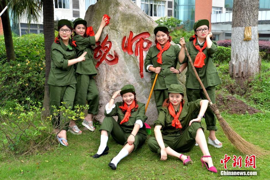 Several senior students wearing safety and industrial costumes take photos in Sichuan Arts and Science University. (CNS/Zhang Ji)